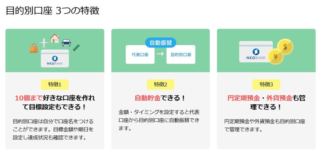 住信SBIネット銀行には「目的別口座」という機能があり、1つの代表口座の中に最大10個まで目的別口座を作ることができます。