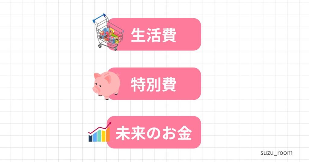 生活費用・特別費(用途が決まっているお金)・未来の貯金に分けて管理するだけで、使えるお金・貯めるお金が自然に把握できるようになり、無理なく貯金が続けられる仕組みが作れます。