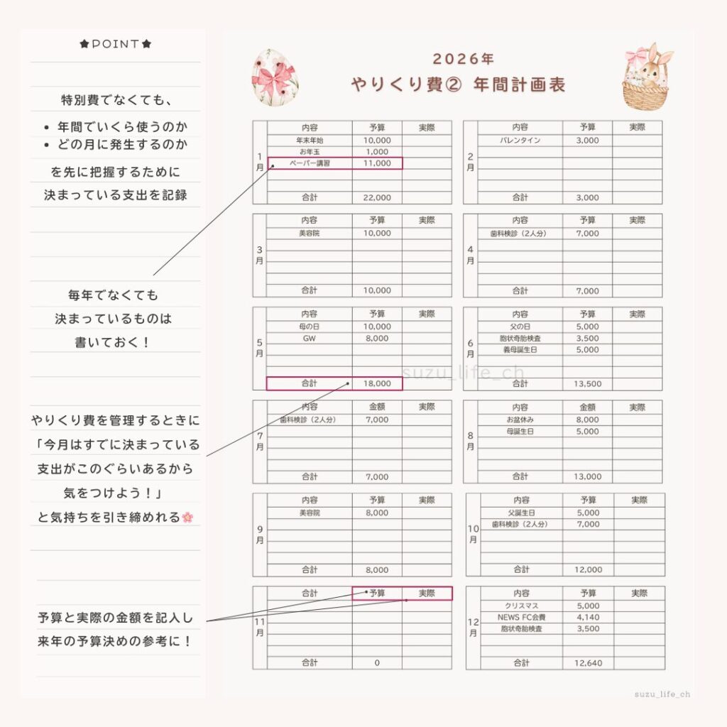 そこで活用したいのが、わが家でも愛用している「やりくり費年間計画表」です。