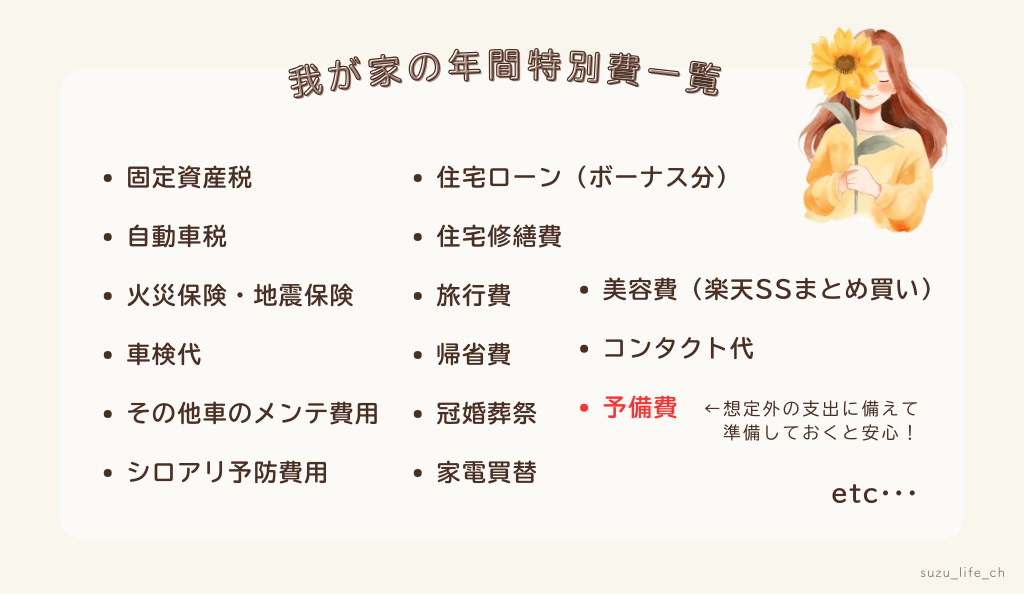 わが家では、次のように「特別費を年間特別費一覧表」を作成してお金の流れを見える化しています。