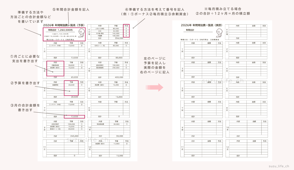 私は毎年12月~1月に前年度を参考に特別費一覧表を作成し、計画を立てています。