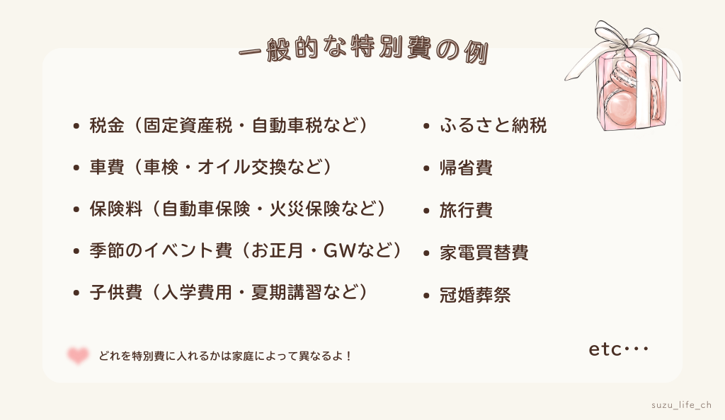 - 特別費:その月の負担が大きい支出