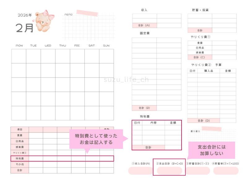 我が家では、特別費として準備したお金は「特別費」の欄には記入しますが、毎月の家計簿の「支出合計」には含めないようにしています。