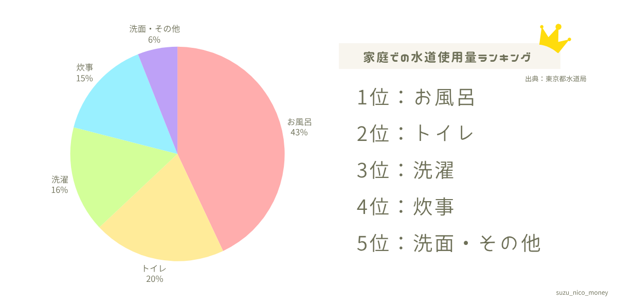 「どこが一番使用量が多いかわかなない!」という方は、以下の「家庭での水道使用量ランキング」を参考にしてみてください👇🏻